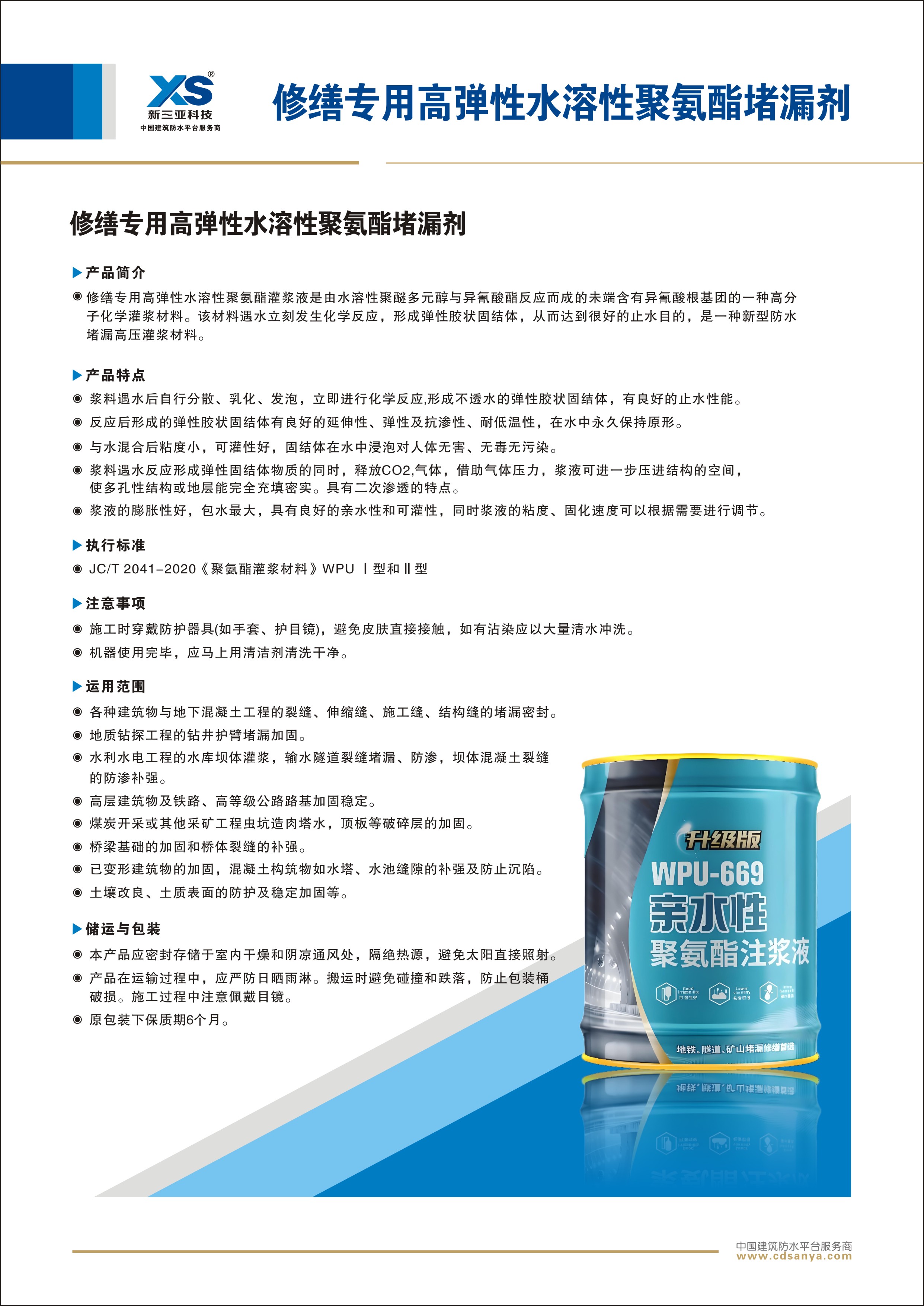 產品簡介: WPU-669水溶性聚氨酯灌漿液是由水溶性聚醚多元醇與異氰酸酯反應而成的未端含有異氰酸根基團的一種高分子化學灌漿材料。該材料遇水立刻發(fā)生化學反應,形成彈性膠狀固結體,從而達到很好的止水目的,是一種新型防水堵漏高壓灌漿材料。 規(guī)格型號: 按產品性能分為Ⅰ型和Ⅱ型 包裝: 7kg/桶 | ![]() |