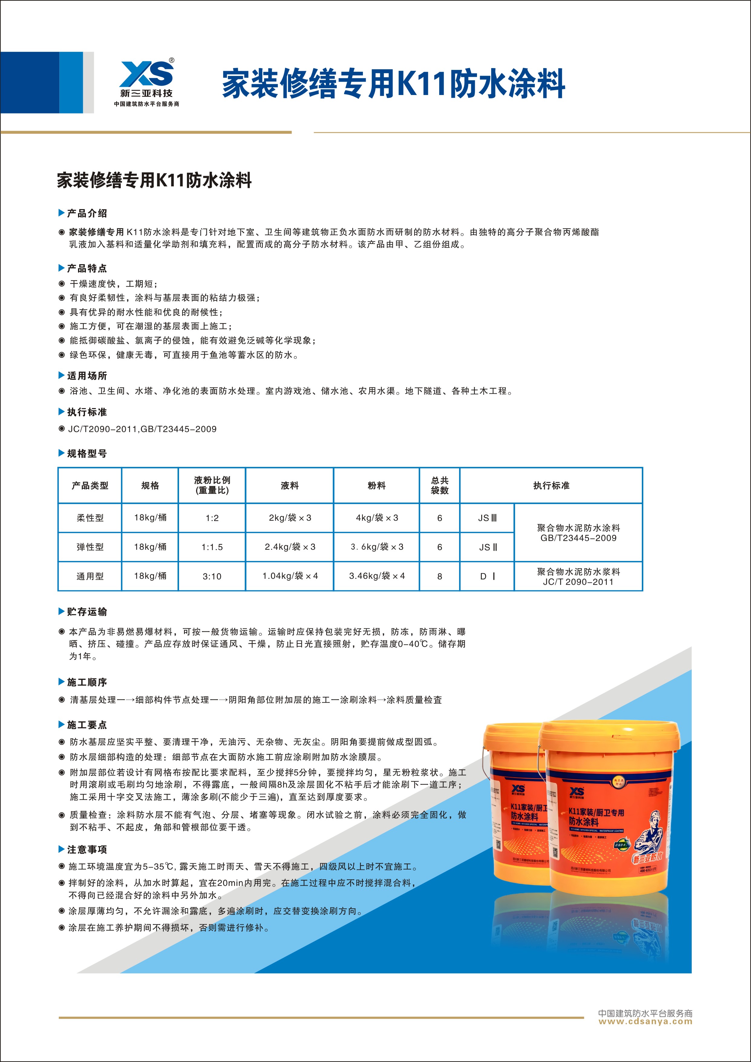 產(chǎn)品簡介: 家裝修繕專用K11防水涂料是專門針對地下室、衛(wèi)生間等建筑物正負(fù)水面防水而研制的防水材料。由獨特的高分子聚合物丙烯酸酯乳液加入基料和適量化學(xué)助劑和填充料,配置而成的高分子防水材料。該產(chǎn)品由甲、乙組份組成。 規(guī)格:18kg/桶 | ![]() |